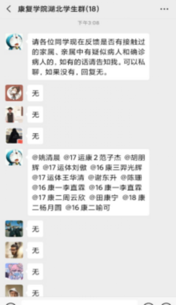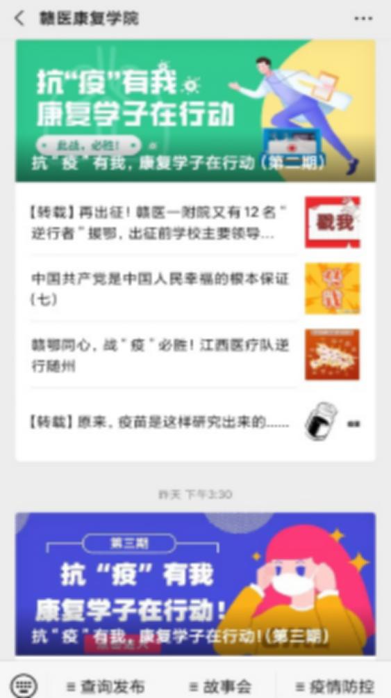 “3”,即做到三个引领:辅导员通过微信公众号、微信群、QQ群等途径教育引导学生网络舆情,不信谣、不传谣、不造谣,通过疫情防控政策和《致康复学院全体学生及家长的一封信》的推送等,传播正能量,强化思想引领;充分发挥学生党支部堡垒作用,向全体学生党员发起《康复学院学生党员疫情防控倡议书》,召开网络主题党日活动,号召全体学生党员关键时刻做表率,当好学生先锋引领;充分挖掘学生及学生直系亲属的先进人物事迹,通过微信公众平台进行宣传,树立榜样,加强榜样引领。