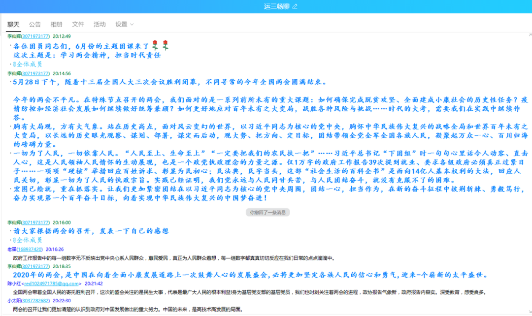 2020年6月3日,各班级利用腾讯会议,直播,QQ群讨论等方式开展了线上主题团课。
