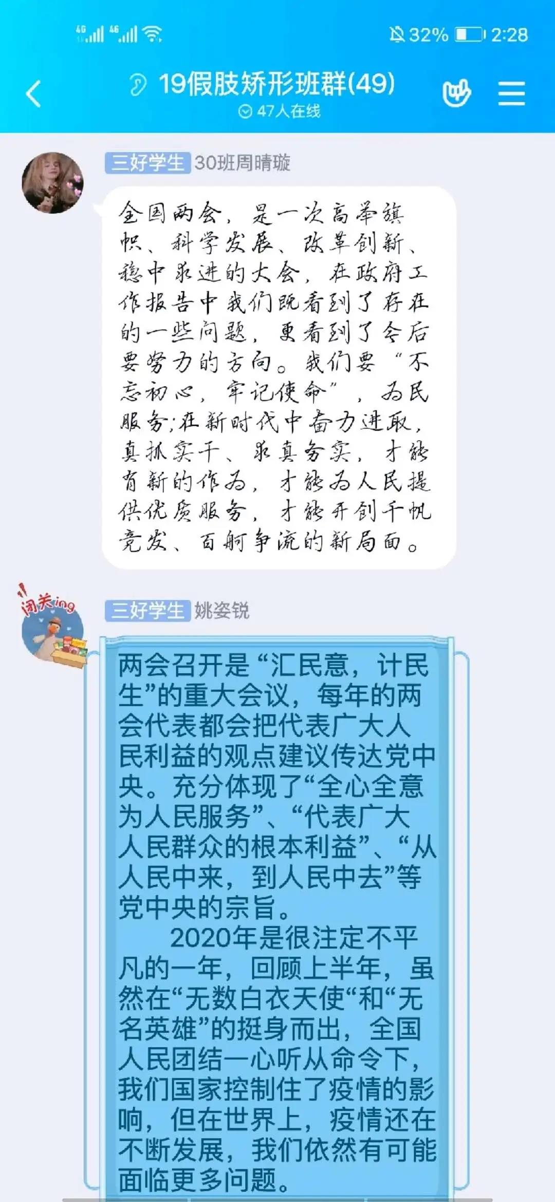 同学们围绕“学习两会精神,担当时代责任”主题开展热烈讨论,表达自己的看法和感想。