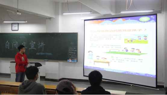 宣讲人运用慧聪中心提供的小短片介绍了自闭症的病因和表现,让大家初步认识了孤独症,然后详细讲解了自闭症的症状以及从康复专业角度如何帮助自闭症儿童,并呼吁大家对“星星的孩子”多一份理解、多一份关爱,用心去温暖他们的心灵,用爱去填充他们的情感。