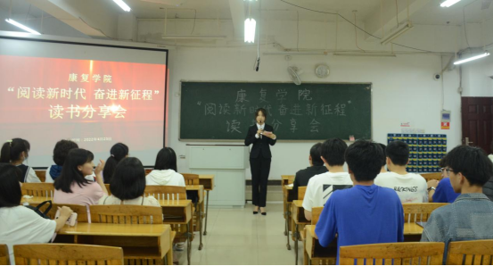 4月23日晚,康复学院在黄金校区第一教学楼215教室开展 “阅读新时代,奋斗新 征程 ”读书分享会。 该院学工办老师以及近40名在校生参加。