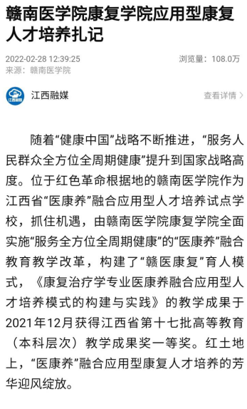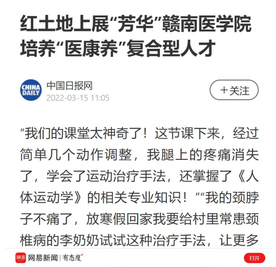 近日来,我院育人典型事迹《红土地上展“芳华”赣南医学院培养“医康养”复合型人才》被新华社、中国日报网、中国新闻网、网易新闻等多家主流媒体报道。