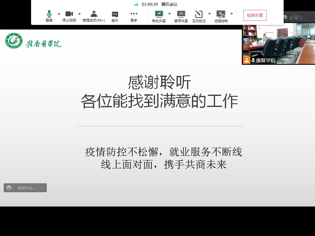温优良对全体毕业生做了就业动员讲话,并结合自身多年工作经历,从“二战”考研还是找工作、选择公立医院还是私立医院、疫情期间面试的技巧等方面与毕业生进行了交流答疑。