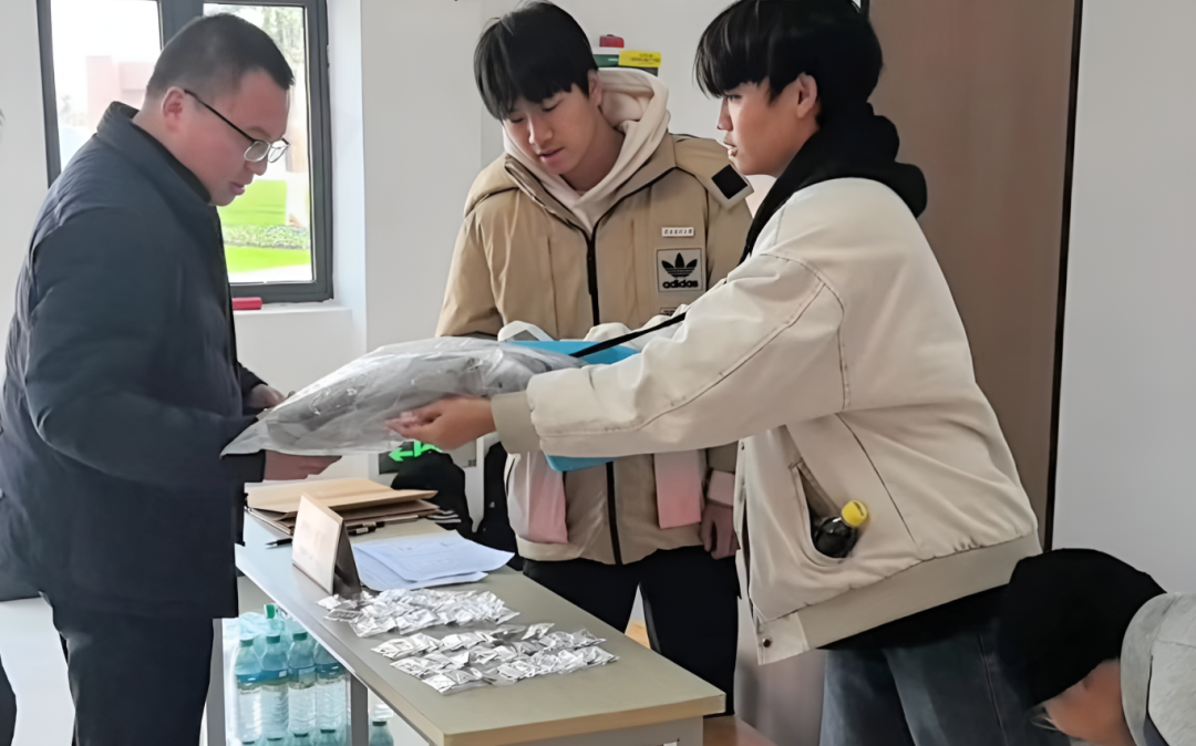 在校学生代表为校友送上崭新的赣南医科大学校徽,校友则有序地领取了各班级的纪念品和服装。