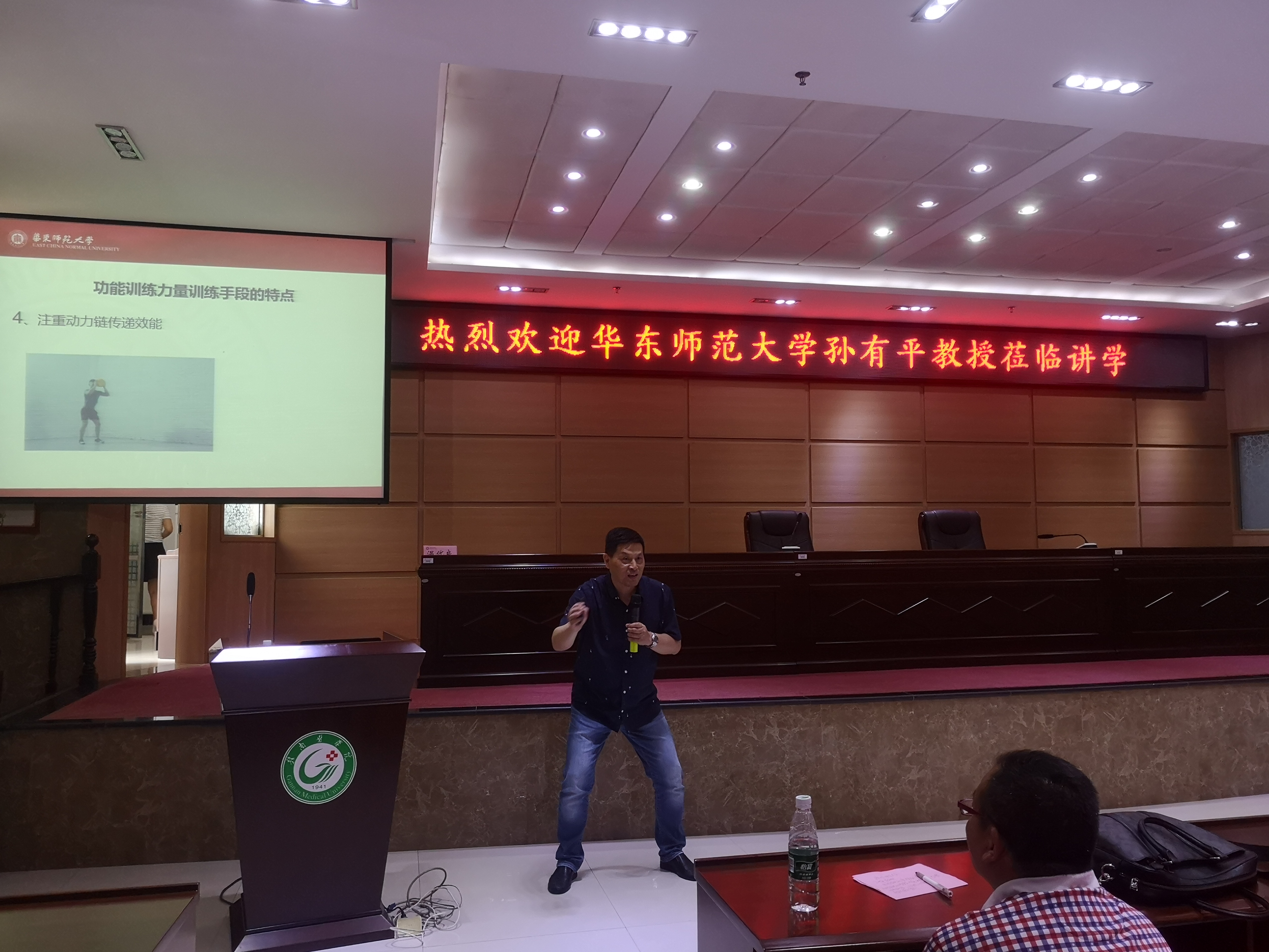 6月5日下午,华东师范大学体育与运动学院孙有平教授应邀来我校讲学,作了题为《现代体能训练及其发展趋势》的讲座。康复学院副院长(主持工作)温优良主持讲座,该院党委书记陈建文、相关学科专业教师及学生200余人到场聆听。