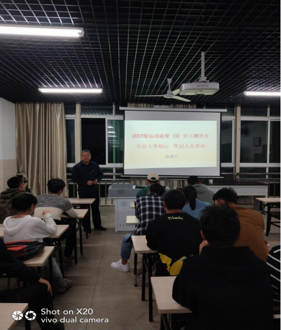 2019年11月6日上午,康复学院党委书记陈建文在黄金校区康复楼307教室与2017级运动康复专业本科1班同学见面,班主任李祖建以及班级全体学生参会。