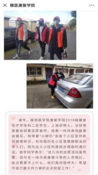 “3”,即做到三个引领:辅导员通过微信公众号、微信群、QQ群等途径教育引导学生网络舆情,不信谣、不传谣、不造谣,通过疫情防控政策和《致康复学院全体学生及家长的一封信》的推送等,传播正能量,强化思想引领;充分发挥学生党支部堡垒作用,向全体学生党员发起《康复学院学生党员疫情防控倡议书》,召开网络主题党日活动,号召全体学生党员关键时刻做表率,当好学生先锋引领;充分挖掘学生及学生直系亲属的先进人物事迹,通过微信公众平台进行宣传,树立榜样,加强榜样引领。