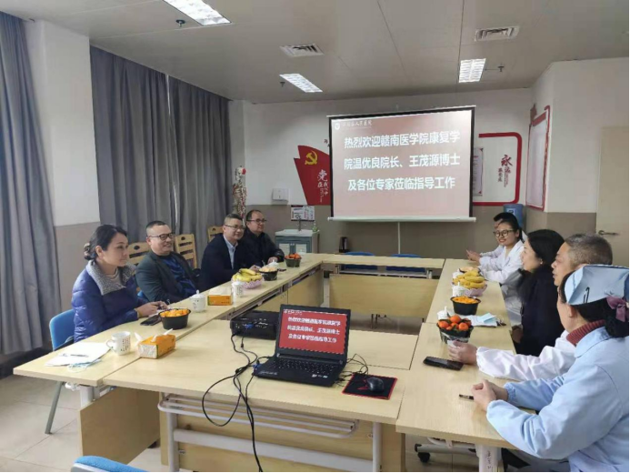 在兴国中医院,双方进行了座谈交流,兴国县中医院党委书记廖石明,院长朱福彬分别介绍了医院院区搬迁后建设情况,康复相关科室情况以及医院未来发展方向。双方就康复专业建设,现代康复与传统中医结合、“大康复”理念等进行了交流。会后,在兴国县中医院院长朱福彬陪同下,考察组一行参观了新建成的住院大楼,康复科病区以及康复相关科室。